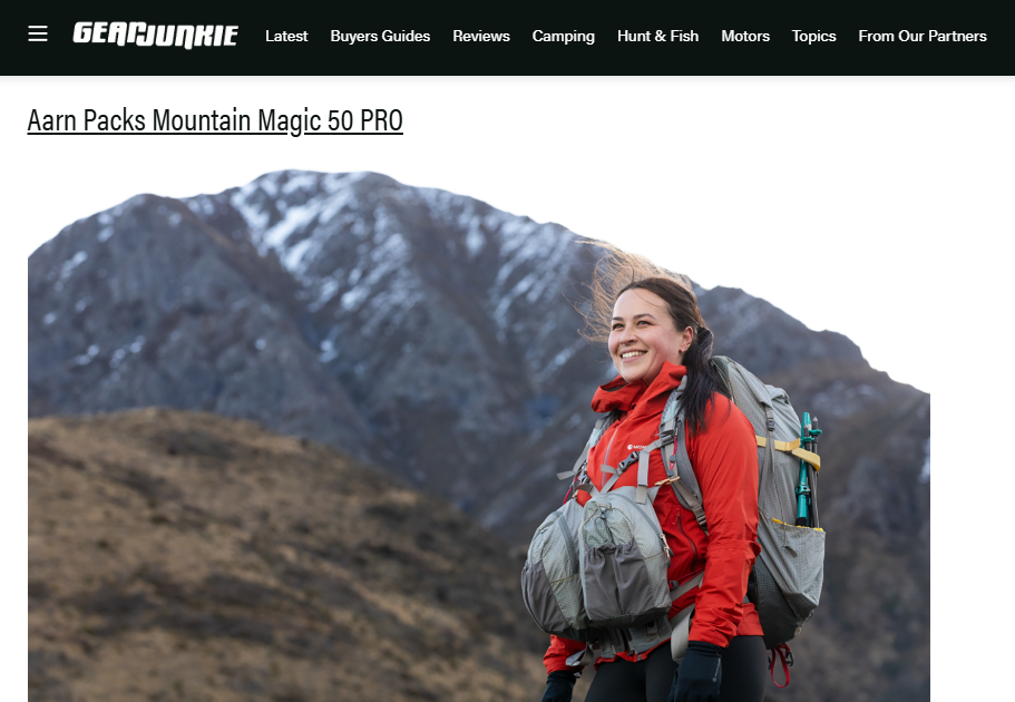 Aarn Packs was mentioned in the 'Emerging Gear' section of the Gear Junkie Website in February 2025.