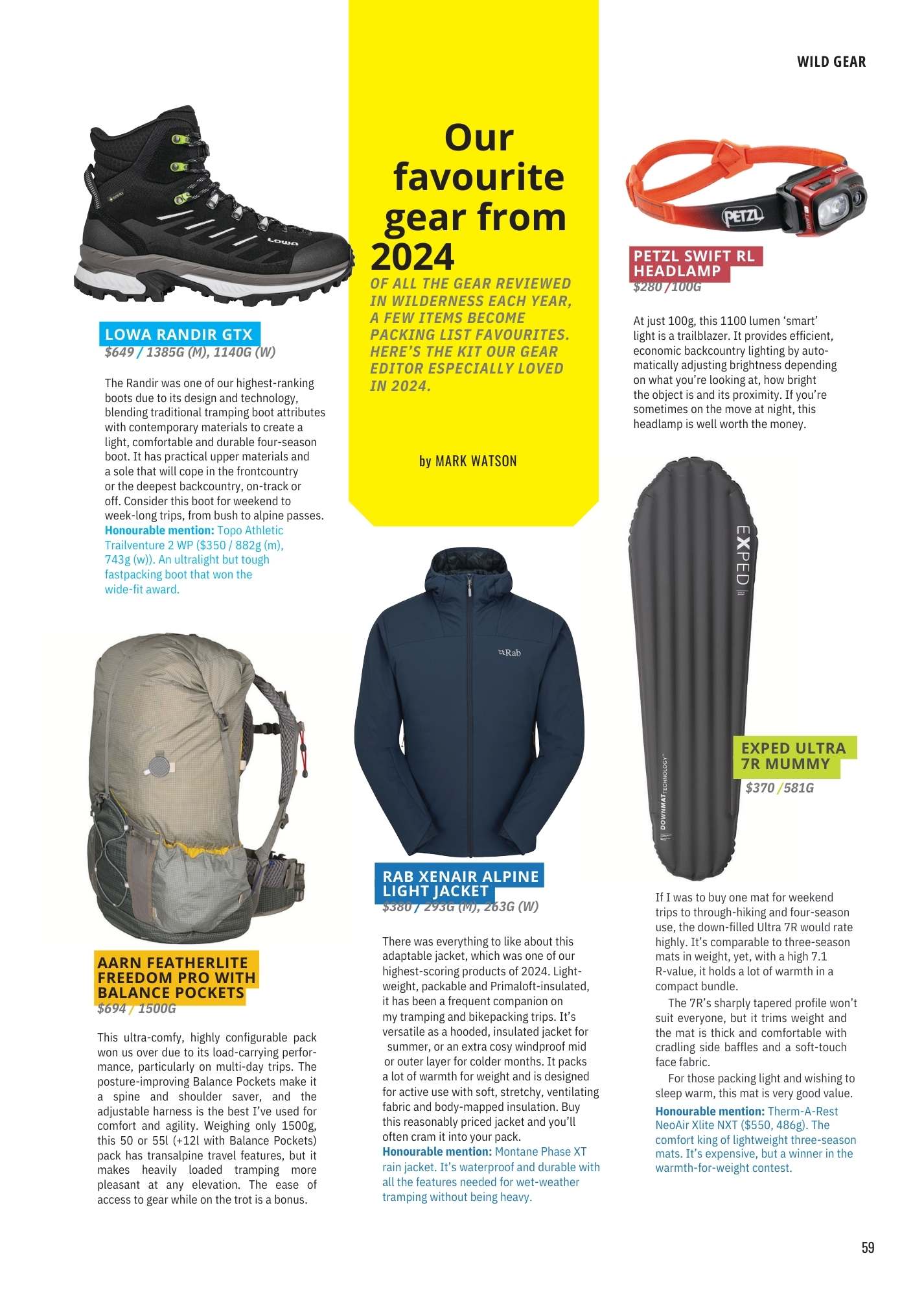 Our Featherlite Freedom PRO pack was featured in Wilderness Magazine's "Our Favourtie Gear from 2024" feature in their March 2025 issue.