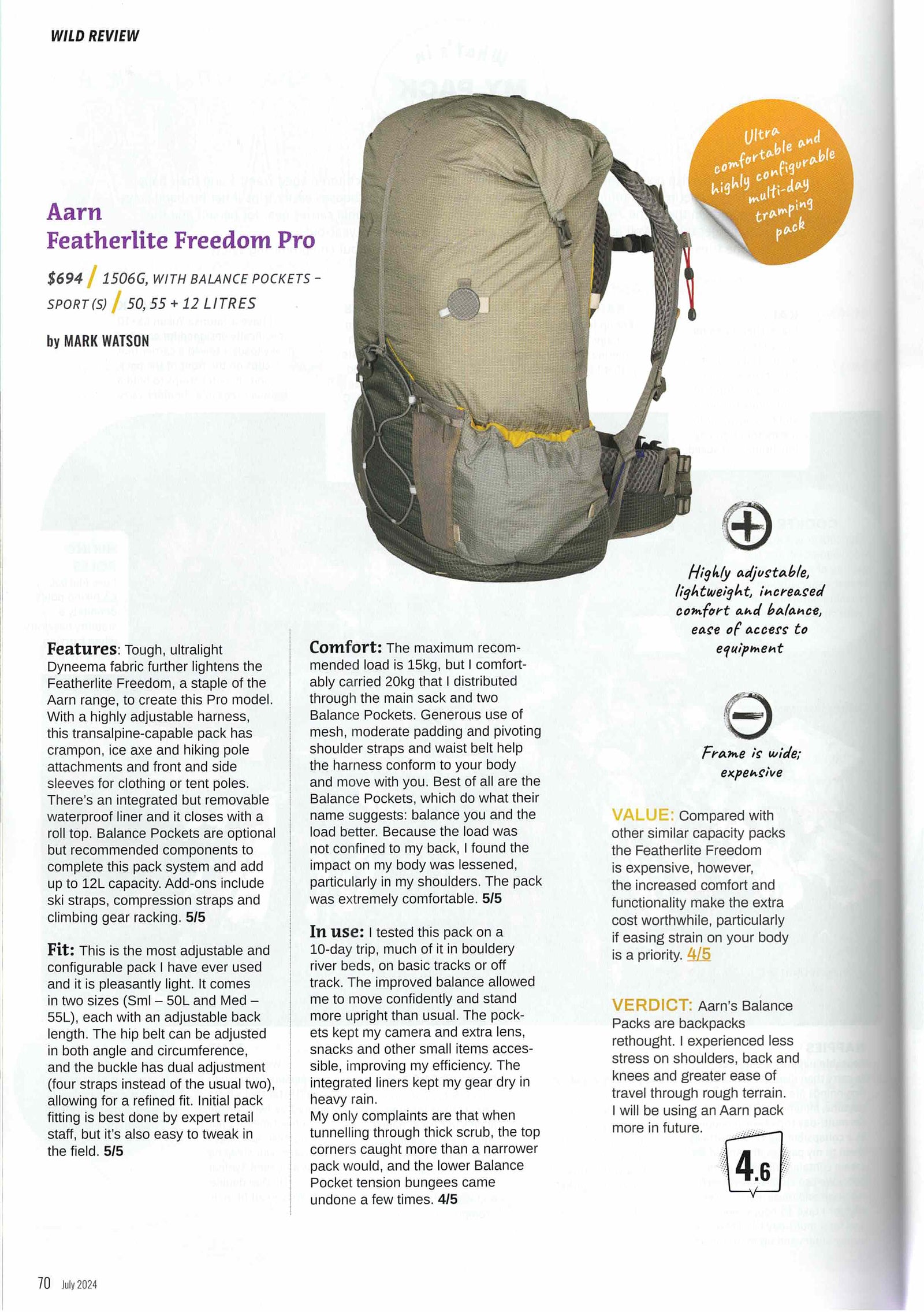 Our Featherlite Freedom Pro Pack was Reviewed in Wilderness Magazine (NZ) in July 2024.