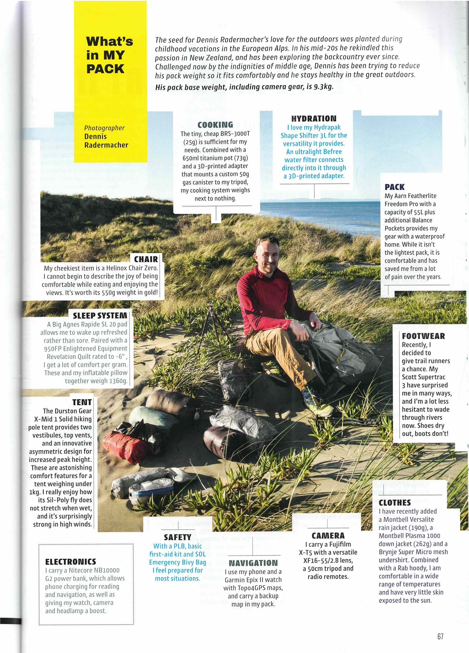 Our Featherlite Freedom PRO pack was featured in Wilderness Magazine's 'What in my pack' with Dennis Rademacher in November 2023.